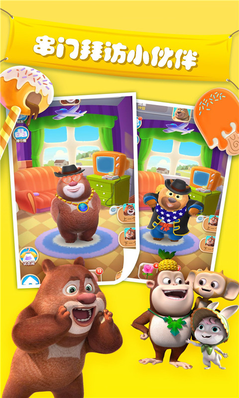 全新养成玩法,在照顾熊大熊二的饮食起居中与熊大熊二一起成长!客厅、餐厅、浴室、卧室,四大场景自由切换,壁纸、地板、床垫、窗户等等统统都可自由定义,小伙伴都可独立打造自己的乐园吆!想知道别人怎么打扮的?全新“串门”玩法,任意查看其他小伙伴的装扮。