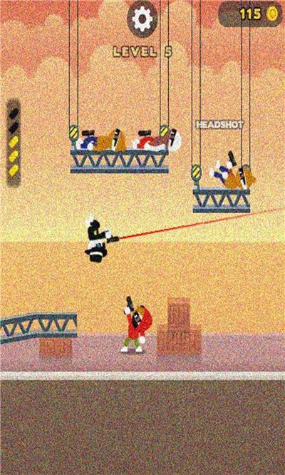 非常好玩的射击挑战游戏。游戏中,你需要在黑衣人跳跃翻转后准确点击屏幕将子弹射向对手,但不要误伤人质。游戏中还有一个爆炸桶,也是你的助推道具。