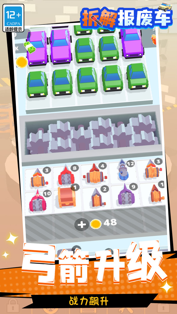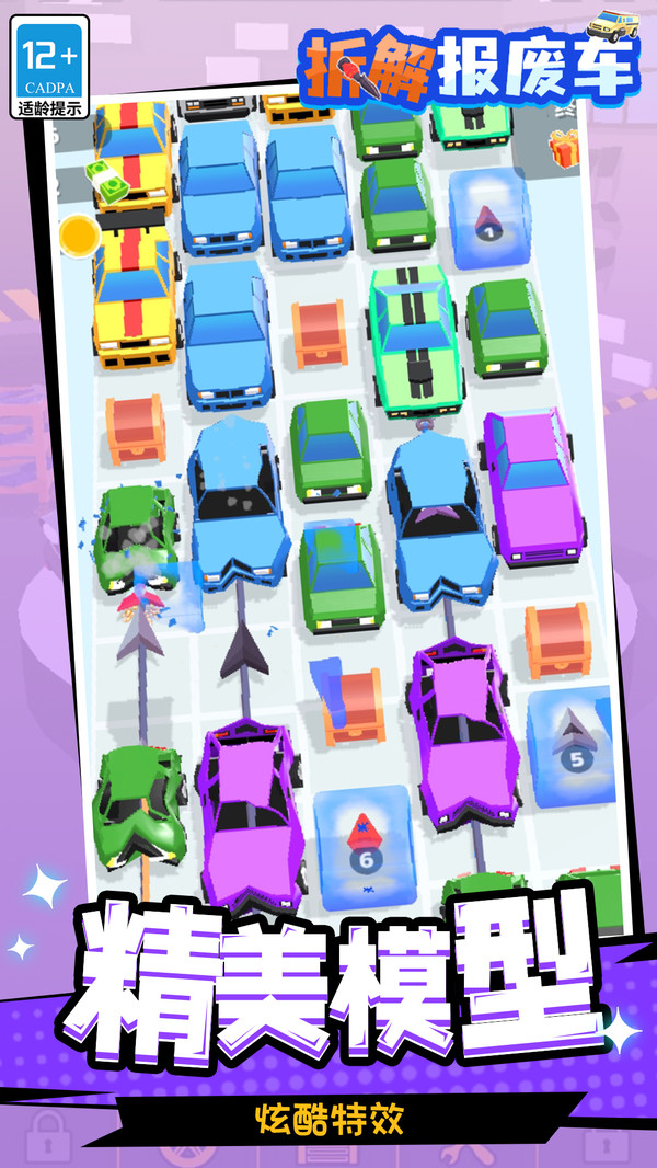 拆解压碎:使用工具拆解部件(如引擎、轮胎),压成废铁块,过程需手动操作增加趣味。