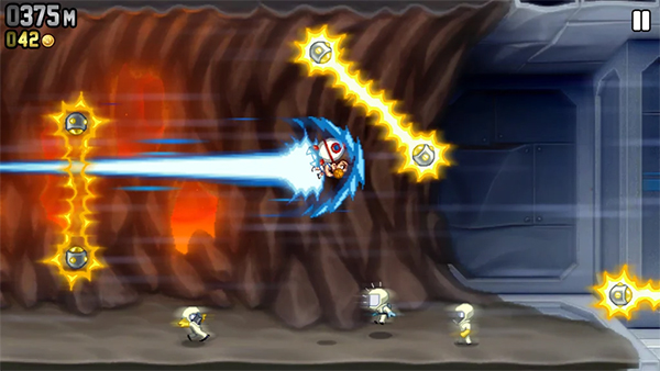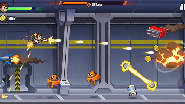 疯狂喷气机2是一款融合了跑酷与飞行射击元素的动作冒险游戏。玩家将扮演主角巴里・斯特克莱斯,背着喷射背包在高科技实验室等场景中往前冲刺。过程中需闪躲激光、导弹等障碍,同时射击前方敌人并收集金币和能量道具。游戏采用章节式关卡设计,每个关卡都附有任务目标,不再是无限奔跑。