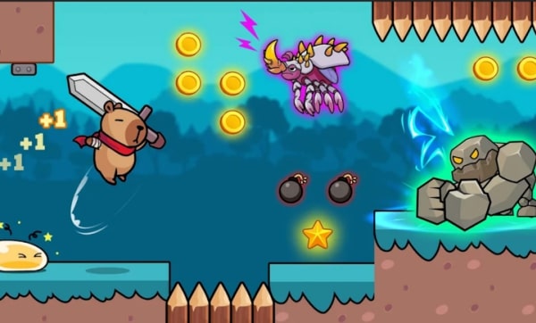 战斗系统:水豚可以挥动专属佩剑击退沿途怪物,每 12 个关卡会遭遇强力 BOSS,玩家需观察 BOSS 的攻击模式并制定相应策略来战胜它们。