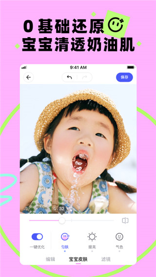 手机修图神器,分分钟拯救废片!0基础还原宝宝清透奶油肌,增加宝宝气色,更有众多滤镜任你选择。