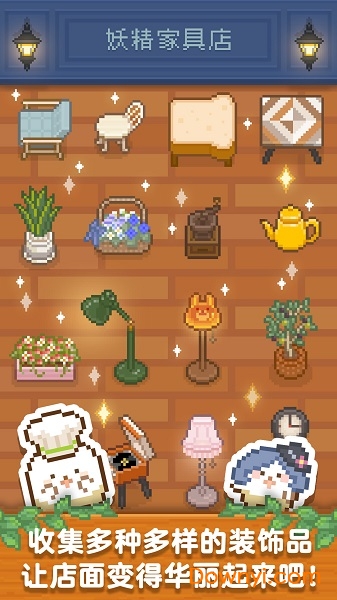 2、改变店内装饰吧,前往家具店和抽奖中心可以获得丰富多彩的店内装饰品。摆在店里,创造个性的面包店吧!超过200种装饰物品可供选择,打造专属于你的梦幻店铺。