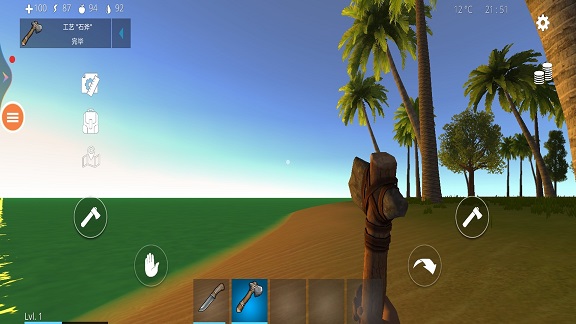 1、进入荒岛后,优先搜集木材、石块等基础物资,利用物资按照配方制作石斧等基础工具,提升物资获取效率。