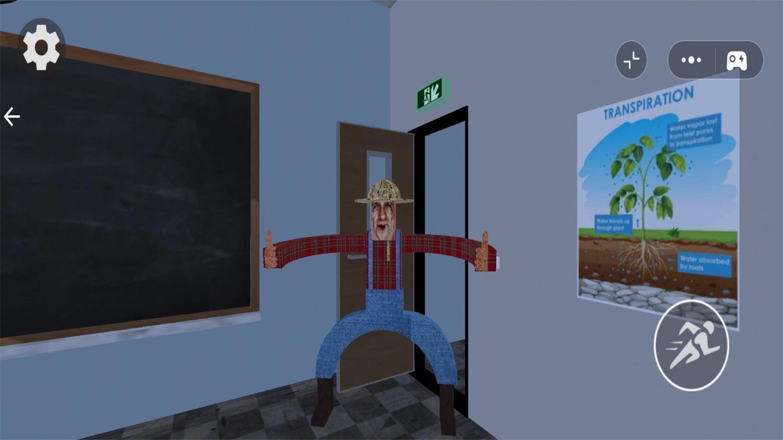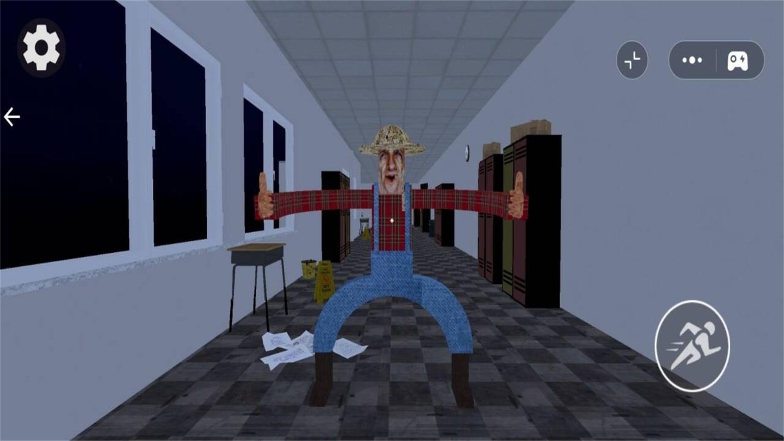 1.玩家身处封闭教室环境,直面稻草人怪物"约翰"的追击,通过细腻的环境渲染与音效设计,营造持续高压的紧张感。