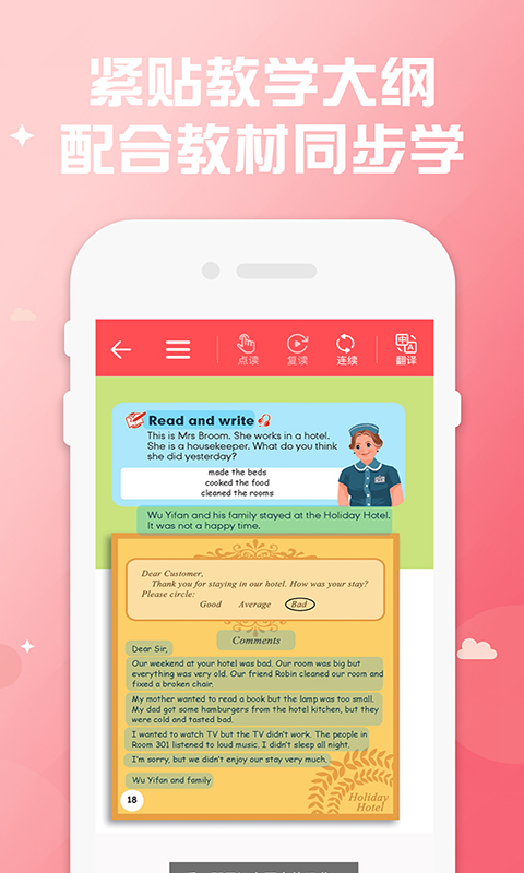 1、教材同步学习功能覆盖小学全年级英语课程,每篇课文都配有纯正英语发音朗读,支持逐句点读翻译。学生可以根据自身需求选择跟读练习或连读训练,系统会自动评分并纠正发音,有效提升口语表达能力。