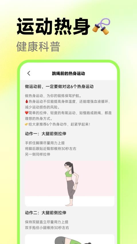 2、在训练前务必查看跳绳拉伸知识库,学习正确的热身方法。系统提供分步骤视频指导,用户可跟随专业教练完成全套热身动作,为正式运动做好准备。