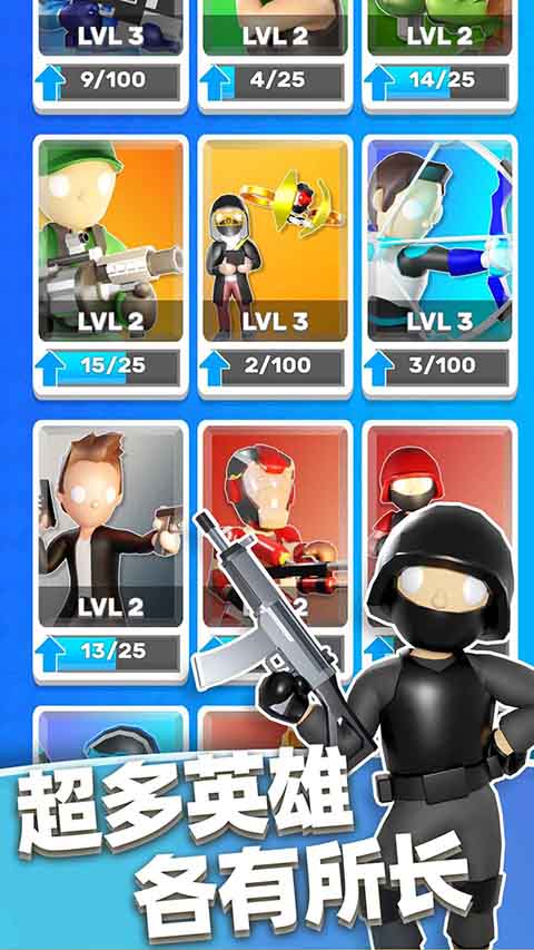 英雄系统:游戏中有 6 个可以升级的英雄,每个英雄都有独特的技能和属性,玩家可以根据战斗的实际情况选择不同攻击方式的英雄组成小队。完成关卡后还可以获得新英雄,这些英雄可以进行升级。