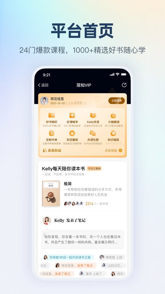 "Kelly每日伴读"板块由简知App联合创始人亲自领读,采用"1+7"陪伴式学习法,即1天导读加7天深度解读,通过每日打卡、读书笔记分享等功能强化学习效果。该板块已累计服务超过50万用户,完读率高达92%。"简知VIP"精选书库采用专家委员会三重筛选机制,每季度更新200+新书,特别增设"主题阅读包"和"作者面对面"特色服务。VIP用户可享受专属学习顾问、优先参与线下读书会等12项特权。"简知书院"创新采用"游戏化学习"模式,设置阅读勋章、知识积分等激励体系,每周配套思维导图、重点金句卡片等学习工具,让深度阅读变得轻松有趣。
