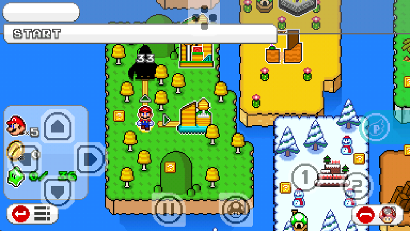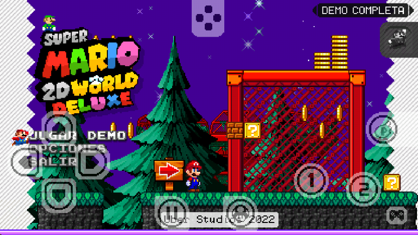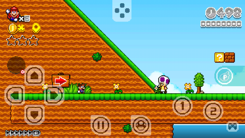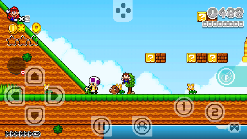 基本操作:玩家通过虚拟按键控制马里奥移动、跳跃和攻击。向左、向右方向键控制马里奥移动,跳跃键进行跳跃,还可以通过跳跃踩踏敌人或使用攻击键投掷道具。