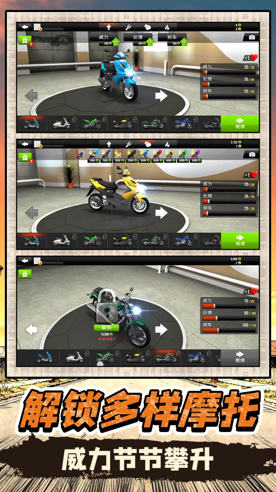 1、游戏内提供多种风格的摩托,玩家可通过完成竞速任务解锁新摩托,还能根据赛道特点选择适配车型,提升通关概率。