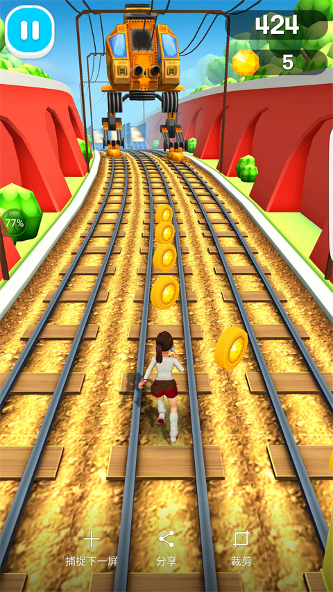 基本操作:玩家通过左右滑动屏幕控制角色改变行进轨道,向上滑动跳跃,向下滑动滚动,以此躲避迎面而来的列车和各种障碍物,同时尽可能收集铁轨上的金币。