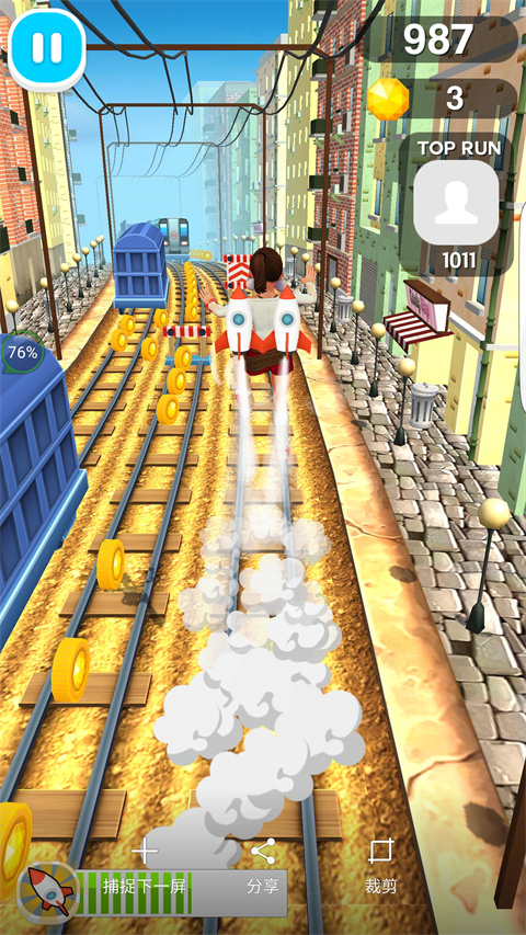 道具使用:游戏中有多种道具,如火箭推进背包可让角色飞一段距离并沿路收集金币;超级运动鞋可让角色跑的更快;金币磁铁能自动收集角色附近一定范围内的所有金币;双倍积分可在一定时间内使获得分数加倍;气垫滑板则提供一个无敌的护照,使玩家在一定时间内不受任何伤害。
