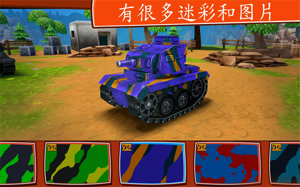 1、Q版坦克设计搭配夸张物理特效,爆炸时产生彩虹粒子效果,场景中的草丛、岩石等元素经过精细手绘处理,视觉效果生动活泼。
