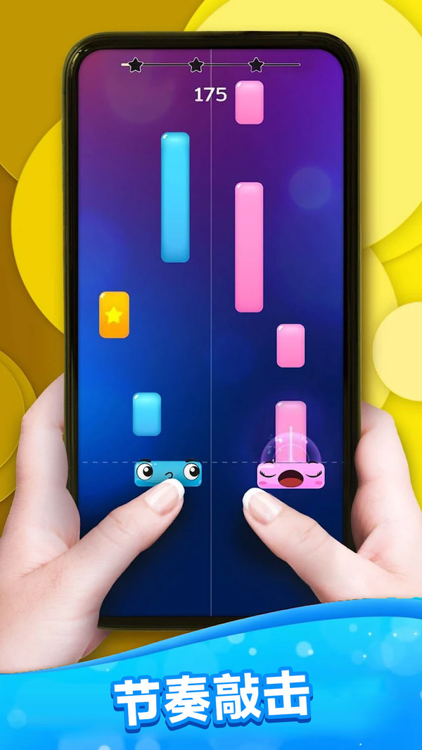 3、双轨设计增加玩法复杂度,同时让敲击音效与歌曲乐器声部呼应,强化二重奏的音乐协作感。