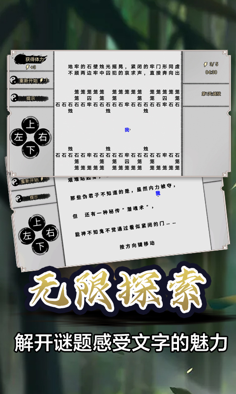 推动"我"字找到通往下一关的路!游戏开始时,玩家需要控制"我"字在文字构成的场景中移动。通过触摸或点击可以与其他文字互动,有些文字可以推动,有些可以组合拆分。随着剧情发展,玩家会解锁更多文字操作方式,比如长按可以查看文字属性,滑动可以将文字拖拽到指定位置。游戏还设置了多种环境互动,比如需要特定文字才能开启的门,或是需要组合文字才能解开的谜题。每个关卡都设计巧妙,需要玩家仔细观察文字布局,思考最佳解谜方案。