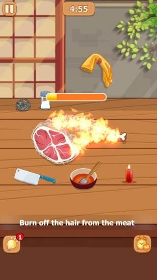 1、作为厨师长,你的首要任务是精准完成每一道菜品,从准备食材开始,例如为火腿去毛、烤制。