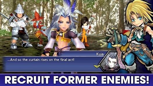 登场角色:已确认登场的角色有 10 位,来自历代《最终幻想》系列,分属远程、近战、支援与敏捷四种战斗类型,包括光之战士、凯因・海温德、克莉露・梅耶・巴尔德希翁、蒂娜・布兰福德、克劳德・斯特莱夫、莉诺雅・哈蒂莉、吉坦・特莱巴尔、雷霆、盖娅、普朗普特・阿金塔姆。