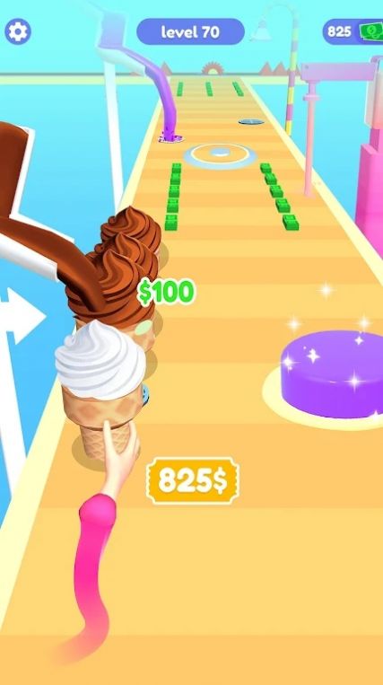 2、精心设计的赛道上布满了各式各样的甜品选择,简单易懂的游戏机制让玩家能够快速上手,轻松享受制作冰淇淋的乐趣;