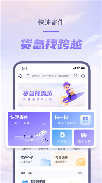 跨越速运是一款非常不错的物流运送平台,在这里不仅满足商家也可以满足用户,在这里可以寄大量的物品,而且价格相对便宜,有很多的分类,损毁就会赔付,喜欢的话快来下载进行体验吧!