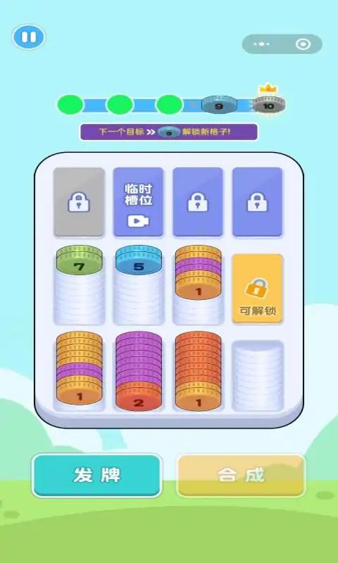 2、相同颜色的硬币聚集在一起是游戏的核心机制。当某个格子被完全填满时,里面的硬币会自动合成为一个更大数字的硬币。这个过程中,玩家需要注意保留足够的空间,避免过早填满格子导致游戏结束。