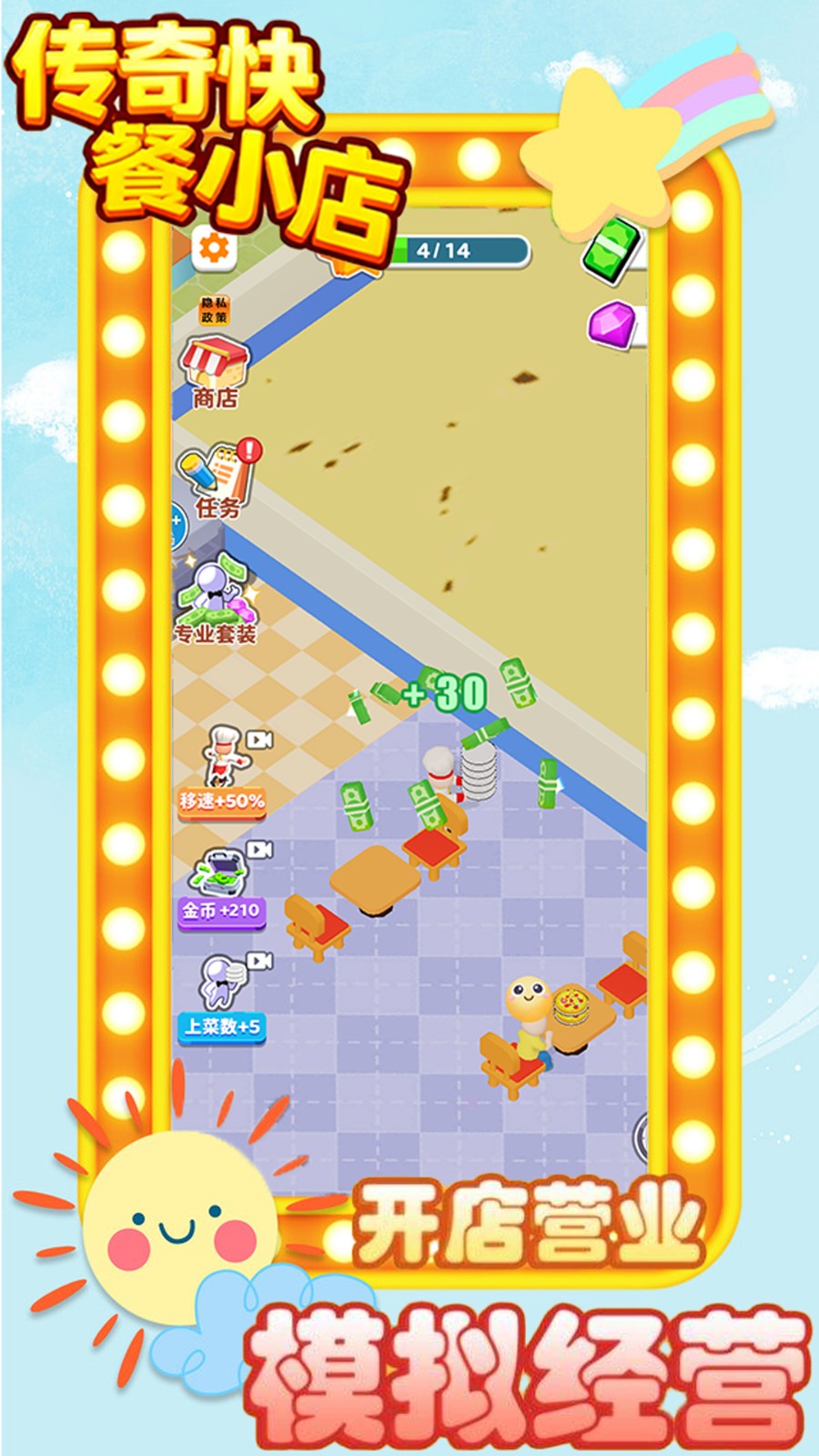 传奇快餐小店是一款特色的经营模拟手游,很好的经营管理自己的快餐小店,每天推出不同的餐品,装饰好内部的环境, 将各种的桌椅板凳合理的摆放,感受经营的日常,想办法来吸引更多顾客们前来,会很好的享受这里,让自己的小店越做越好!
