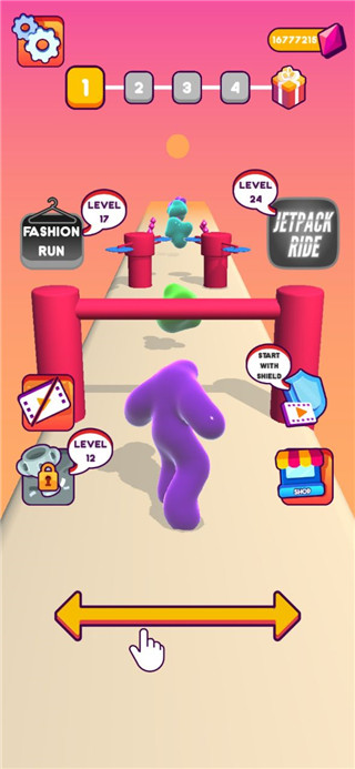 疯狂果冻人是一款由zynga开发的休闲闯关手游,游戏中玩家可以为你的果冻人穿上不同的帽子和皮肤,进入游戏后左右滑动控制人物移动,遇到障碍物会让自己体积变小,所以需要拾取路上的果冻让自己变大。