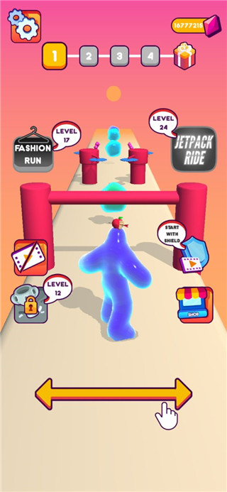 核心闯关:玩家操控果冻人在赛道上左右滑动移动,通过收集同色果冻块来增大体积,体积越大抗伤害能力越强,终点结算奖励也越丰厚。如果触碰尖刺、刀片等障碍,果冻人的体积会缩小。