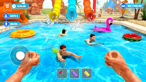 恶搞互动:玩家能用水炮偷袭游客、调整滑梯角度制造混乱等,利用物理引擎实现各种喜剧效果,为游戏增添了不少趣味性。