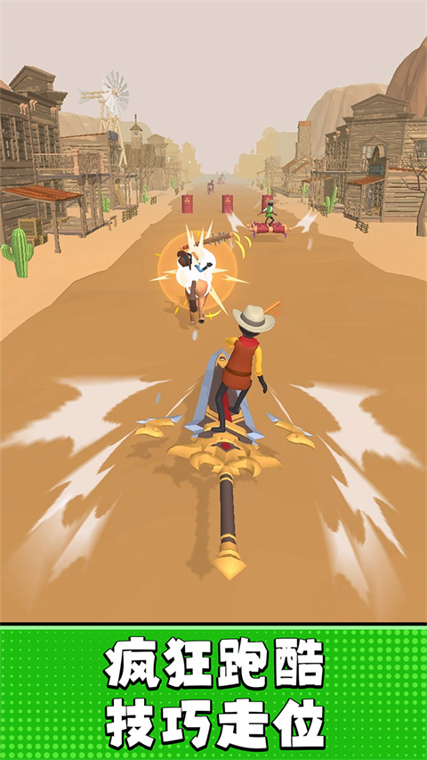 疯狂牛仔是一款由 Ohayoo 发行的休闲竞技手游,游戏中玩家将扮演的是一位西部牛仔,选择出战的武器和马厩,进入游戏中玩家需要不断的击败前面的敌人,一边跑酷一边攻击敌人,在这期间还要躲避周围的木桶以及敌人的攻击。