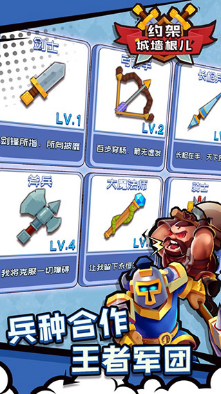 约架城墙根儿是一款以中世纪为背景的休闲策略对战游戏。游戏中采用了卡通的画风设计。游戏运用竖屏放置玩法,你将成为一位领主,招募各种兵种组成强大军团,依据战局制定战术,参与百人对决。