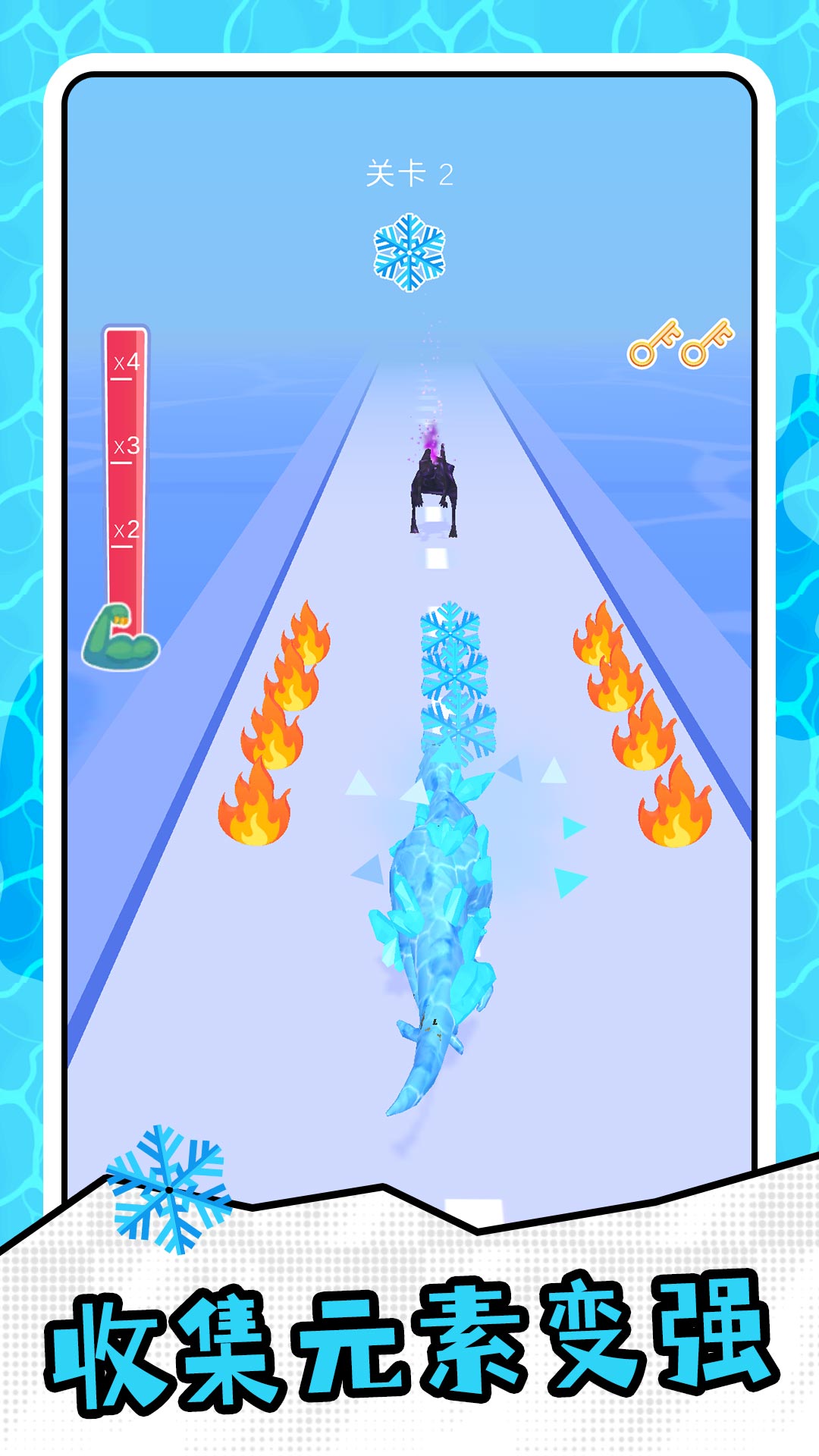 1.玩家通过连续跳跃、转向等基础操作控制恐龙移动,在路径中主动搜寻并拾取火、水、土等元素道具,为后续战斗储备资源。