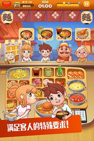 升级餐厅,打造理想中的拉面小镇!各式道具,助你轻松完美过关,不落下一颗星星!
