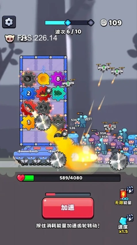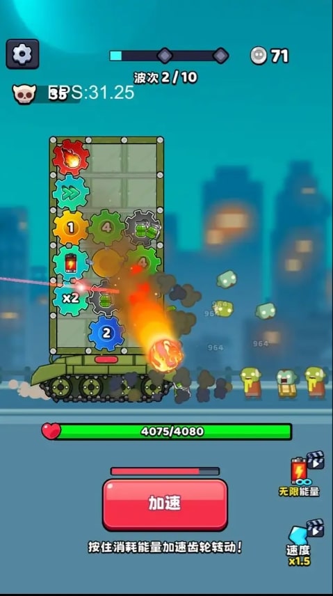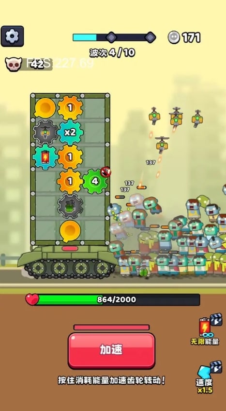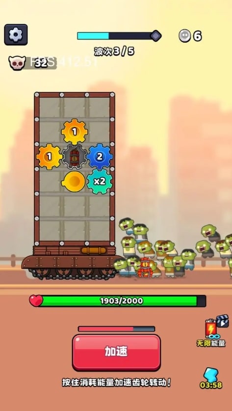 资源管理与升级:在战斗中,玩家要留意能量数值,合理分配资源。完成特定波次的战斗后,可在商店选购更强力的齿轮,如 ×1.5 增益齿轮,提升后续战斗能力。