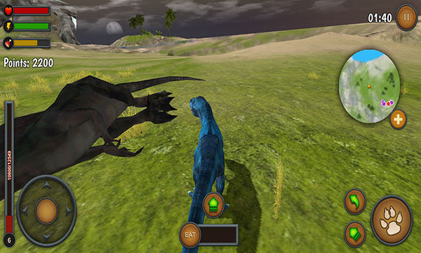 1、使用虚拟摇杆控制你的霸王龙移动,右侧的地图可以查看你周围的恐龙。