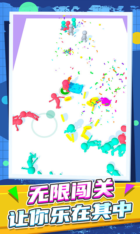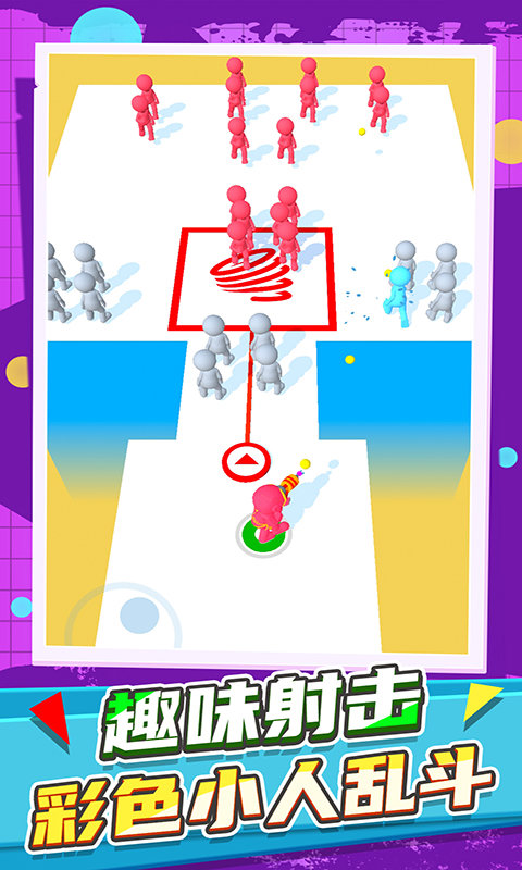 只需要你利用来操控火柴人射击角度,通过简单的滑动和点击即可完成所有操作。控制手中的颜色喷枪射击场上的火柴人,精准命中目标就能将其转化为你的队友。击中的火柴人将加入你的队伍,最终对决会已火柴人多的一方为胜利,这种独特的玩法机制让每场比赛都充满变数。玩家需要准确的把握尽可能的击中火柴人,合理利用场景中的障碍物和道具。这非常考验你的调整角度的能力,灵敏的反应力,以及对战局形势的预判能力。新增的团队技能系统,让配合变得更加重要。