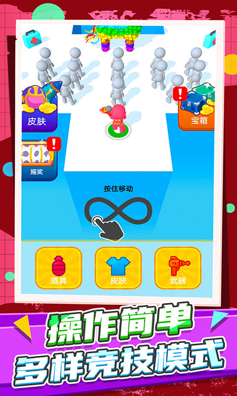 实时多人在线竞技PK玩法给你无尽刺激射击快感,支持最多8人同场竞技,随时开启热血对战。各种超可爱的服装饰品等你满足你的收集欲望,上百种帽子、眼镜等配件任你搭配。简约的美术画面给你耳目一新的视觉体验,鲜艳的色彩搭配让游戏充满活力。新增的赛季系统和排行榜功能,让玩家可以不断挑战自我,冲击更高段位。每周更新的主题活动和限时玩法,保证游戏内容常玩常新。