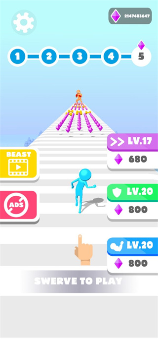 跑酷玩法:玩家需要操控小人在跑酷赛道上前进,通过收集哑铃来壮大自己的臂力,蓝色哑铃可以增强力量,红色哑铃则会削弱力量。同时,玩家还可以收集钻石来升级拳头、移速和防御力。在关卡终点,玩家需要在限定时间内打败 BOSS,BOSS 被打飞的距离越远,奖励就越丰厚。