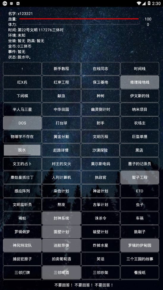 三体模拟系统游戏采用独特的文字叙事风格,通过细腻的文本描述营造出三体世界的神秘氛围。游戏内置完整的《三体》原著阅读系统,玩家可以随时暂停游戏,深入研读小说内容。核心玩法围绕"赶往朝歌"的主线任务展开,玩家需要运用智慧解决途中遇到的各种宇宙社会学难题。游戏特别强调策略思考而非视觉刺激,为玩家提供了一场纯粹的三体文明探索之旅。