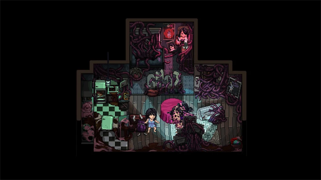 像素暗黑美术风格:采用复古像素画风,场景随主角心理状态动态变幻,从温馨公寓到诡异展览馆,再到崩坏空间,每处细节都暗藏情感隐喻,像素颗粒感放大了恐怖氛围。例如公寓里的日本海浪画与演出海报,暗示着主角的混血身份与舞蹈生涯过往。