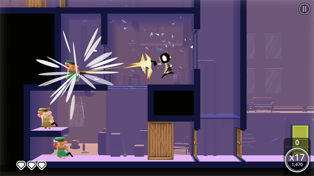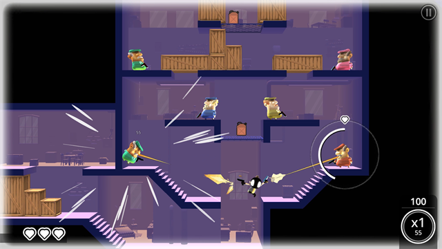 玩家通过滑动屏幕即可完成跳跃、翻滚、射击与踢击等复杂动作,在一连串紧凑的关卡中释放 “枪械舞步”,还能利用墙壁和铁板来反弹子弹杀敌。