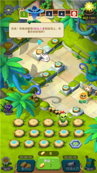 植物合成:玩家可以通过拖动相同等级的植物至一处完成合成,从而获得高阶形态的植物。等级越高,植物的攻击、范围越强,还会同步解锁专属技能,部分植物有独立技能树可升级属性。