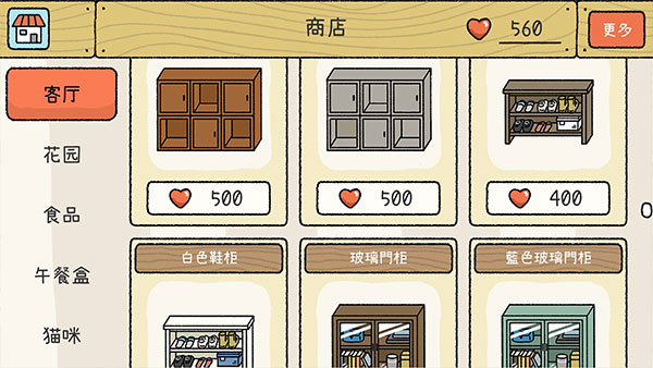 爱心获取:除了通过制作午餐和与猫咪互动获取爱心外,玩家每日登陆游戏、点击拜访的小动物以及看广告等方式也可以获得爱心。爱心可以用来购买家具、装饰、猫咪等物品。