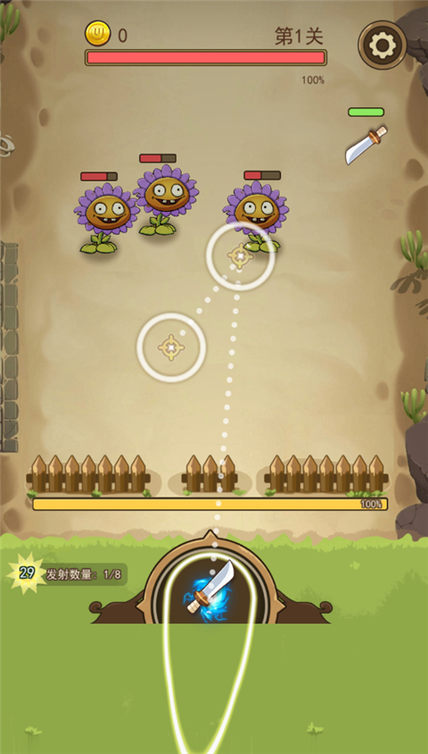 攻击操作:玩家进入游戏后点击开始游戏,选择关卡进入战斗界面。通过拖动屏幕控制武器瞄准方向,武器会自动发射飞刀攻击靠近的敌人单位。