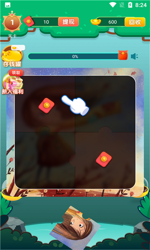完成拼图关卡挑战即可领红包,关卡数量非常多,从简单到复杂循序渐进。挑战关卡并没有时间的限制,玩家能耐心地仔细思考,充分享受解谜的过程。用于制作拼图的图片风格多样化,包含风景、动物、艺术等多种主题,带给玩家丰富的视觉享受。随着关卡推进,拼图难度会逐渐增加,让玩家持续获得挑战的乐趣。