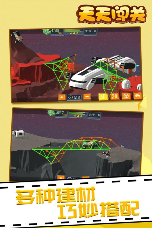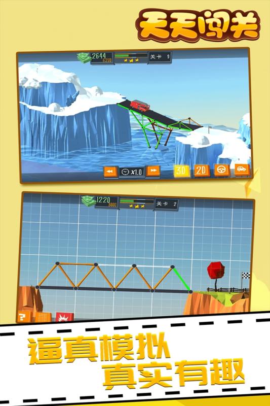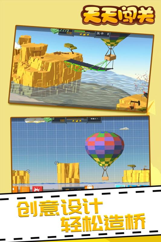 天天闯关是一款极具创意的桥梁建造模拟游戏,为玩家提供了丰富多样的建筑材料选择。从传统的木材、混凝土,到现代的钢铁、缆线,每种材料都有其独特的物理特性和造价差异。游戏特别设置了预算限制系统,玩家需要在有限的资金范围内,合理规划材料使用,既要保证桥梁的承重能力,又要兼顾经济性。更令人兴奋的是,游戏鼓励玩家发挥想象力,可以突破常规思维,建造出各种天马行空的创意桥梁。通过反复尝试和优化,玩家不仅能提升工程规划能力,还能逐渐形成独具特色的建造风格。