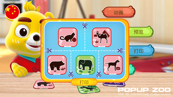 游戏界面设计简洁明了,包含动画、预览、打印、开始等主要功能模块。点击开始按钮后,将设备摄像头对准实体卡片,系统会自动识别卡片内容并展示对应的3D动物形象。打印功能允许用户直接打印各种动物的AR识别卡片,方便随时使用。预览功能则提供了所有动物的AR动态展示,通过移动设备可以切换不同视角观察动物。此外,游戏还设置了丰富的互动环节,比如喂食、抚摸等动作,让孩子与虚拟动物建立情感连接。