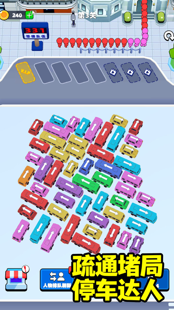 2、融合策略与技巧元素,不仅需要精准判断车辆移动顺序,还需灵活应对排队人物等干扰因素,玩法层次丰富。