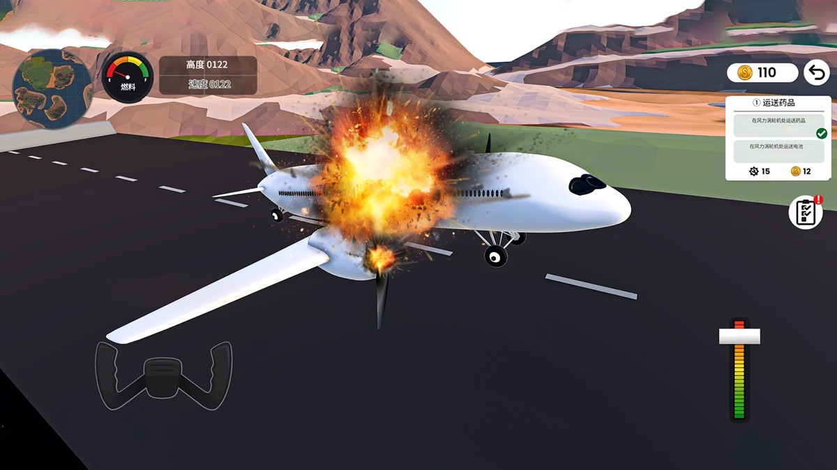 2、选择飞行任务,操控油门、方向盘调整速度与方向,在开放世界地图中穿梭,应对不同地貌与天气带来的影响。