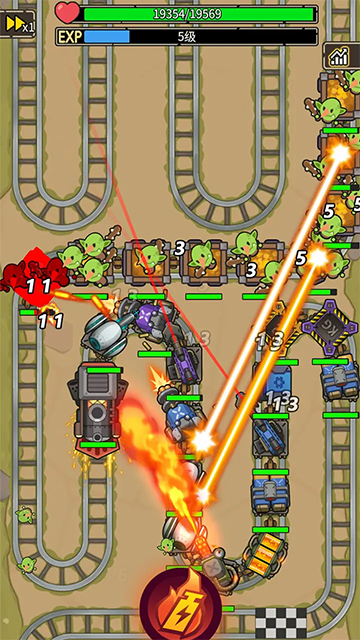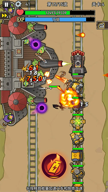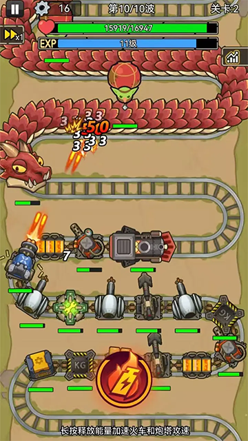 动态战斗与能量加速:火车前行时炮塔会自动攻击沿途敌人,车头还能直接撞击敌人。长按屏幕中间的能量按钮,可同时提升火车前进速度和所有炮塔的攻击速度,便于快速突破敌人密集区域。